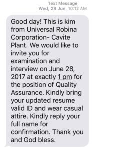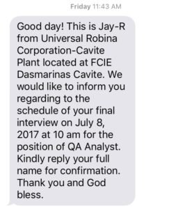 These are just some of the questions I encountered during the interview. Afterward, the trainee submitted my credentials to the HR head and said, “Thank you. Please wait for the next text message to schedule your final interview.” And that concluded my initial interview experience.