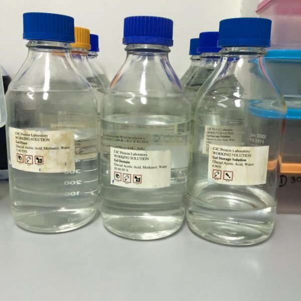 12. Once the SDS gels containing protein samples are ready, transfer them to individual containers. Add gel fixer and place the containers on a shaker for 30 minutes. Then, immerse the gels in a gel stain for 20 minutes, followed by a gel de-stain for 45 minutes. Finally, store the gels for at least one hour.